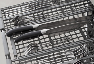 Легко и удобно регулируется высота верхней корзины, даже при полной её загрузке. Это очень просто: корзина и при помощи удобных ручек поднимается или опускается, даже в заполненом виде. Благодаря этому вы можете свободно использовать пространство посудомоечной машины и поставить в нее даже очень большие блюда и кастрюли.