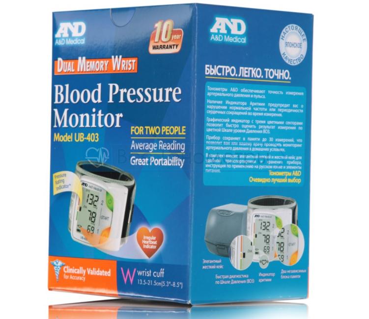 AND UВ-403 для измерения уровня артериального давления и контроля пульса полностью автоматический. При необходимости можно рассчитать средний показатель давления. Прибор обладает функцией выявления аритмии, шкалой измерения давления ВОЗ. Удобная манжета, окружность которой достигает 21.5 см, крепится на запястье руки. Прибор оснащен большим монитором, шрифт сообщений крупный, а значит, тонометр идеален для пользования слабовидящими или пожилыми людьми. Тонометр