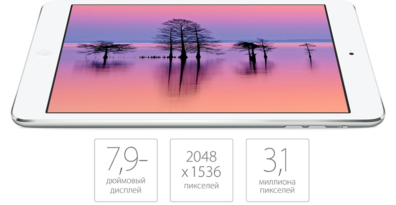 Новый iPad mini with Retina display получил Retina-дисплей разрешением 2048 х 1536 точек, при плотности изображения 326 пикселей на квадратный дюйм. Пиксели так близко расположены друг к другу, что ваши глаза не могут их различить. Фото и видео показывают невероятную детализацию, а текст никогда не выглядел так предельно четко. При этом экран имеет олеофобное покрытие, препятствующее появлению отпечатков пальцев.