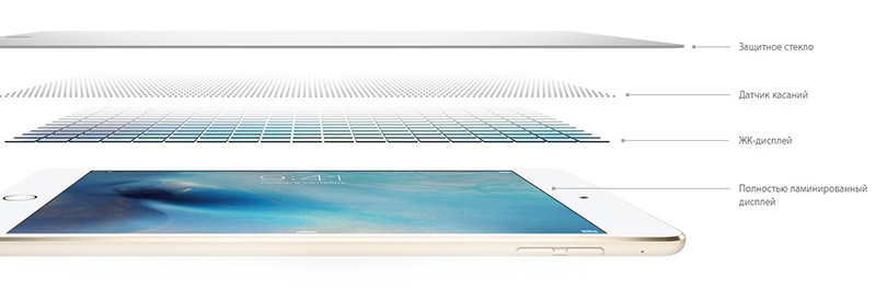 Дисплеи iPad mini предыдущих поколений производились из трёх отдельных компонентов. В iPad mini 4 их объединили в один. Исчезло расстояние между слоями, а вместе с ним и внутренние блики. Кроме того, обновлённый дисплей лучше передаёт цвета — они стали насыщеннее на 44%. А благодаря тому, что дисплей полностью ламинирован и обладает большей цветовой насыщенностью, тексты и изображения на нём стали более яркими, чёткими и реалистичными.
