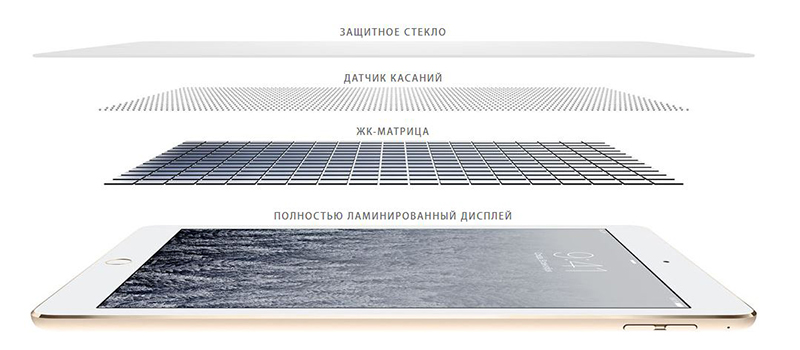 Чтобы сделать iPad Air 2 невероятно тонким, мы заново сконструировали дисплей Retina, объединив три его слоя в один. Теперь дисплей не только тоньше, но и лучше: цвета стали ярче, а контрастность — выше. Мы также добавили антибликовое покрытие, благодаря которому iPad Air 2 отражает меньше света, чем любой другой планшет в мире.