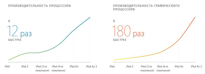 Процессор A8X обрабатывает графику в 2.5 раза быстрее, чем процессор A7. iPad Air 2 обеспечивает графическую производительность, ранее доступную только на настольных компьютерах и игровых приставках. Игры со сложной графикой и приложения для обработки видео работают превосходно и выглядят потрясающе на просторном дисплее Retina.