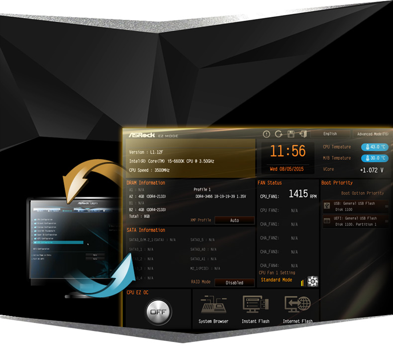 Функция Fast Boot загружает компьютер настолько быстро, что у пользователей нет возможности войти в UEFI во время показа сообщений POST. Технология ASRock Restart to UEFI позволяет автоматически загружать UEFI при следующем включении или перезагрузке компьютера. Предназначена для тех, кому приходится часто заходить в настройки UEF.