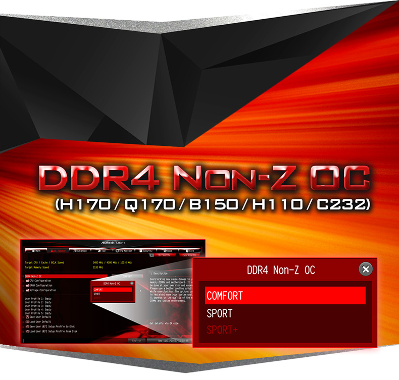 Теперь разгонять память DDR4 можно не только на моделях с чипсетом Z170. Благодаря функции «ASRock DDR4 Non-Z OC» под разгон попадают модели H170/Q170/B150/H110/C232 с определенными модулями памяти DIMM, например, Kingston или Samsung. Снижение показателя задержка «CAS latency» позволяет повысить производительность в пределах 5 процентов.
