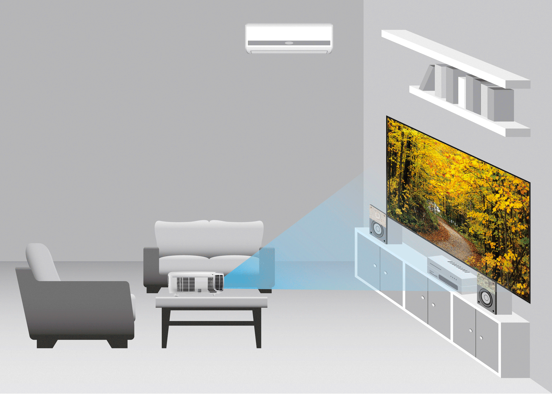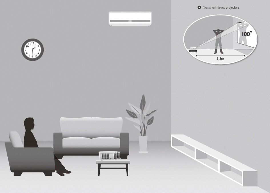 Благодаря короткофокусной технологии вы получите большое изображение даже в небольшом помещении. С расстояния всего 2.5м. вы сможете насладиться картинкой размером 100” . Поэтому ставить проектор можно в любое место в вашей комнате.