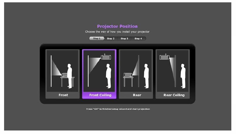 При первом включении W1110 просто следуйте визуальным инструкциям, которые помогут вам правильно настроить проектор.
