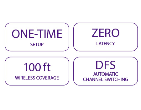 Для установки Wireless Full HD kit вам потребуется всего несколько простых шагов. Трансмиттер и ресивер автоматически подключатся к проектору. Кстати, ресивер, который устанавливается на правую сторону проектора, не требует дополнительной розетки питания. У вас не возникнет никаких проблем с подключением. Все легко и просто. С технологией автоматического переключения каналов Dynamic Frequency Selection (DFS), вы получаете невероятно стабильное HD-качество потокового видео, без помех.