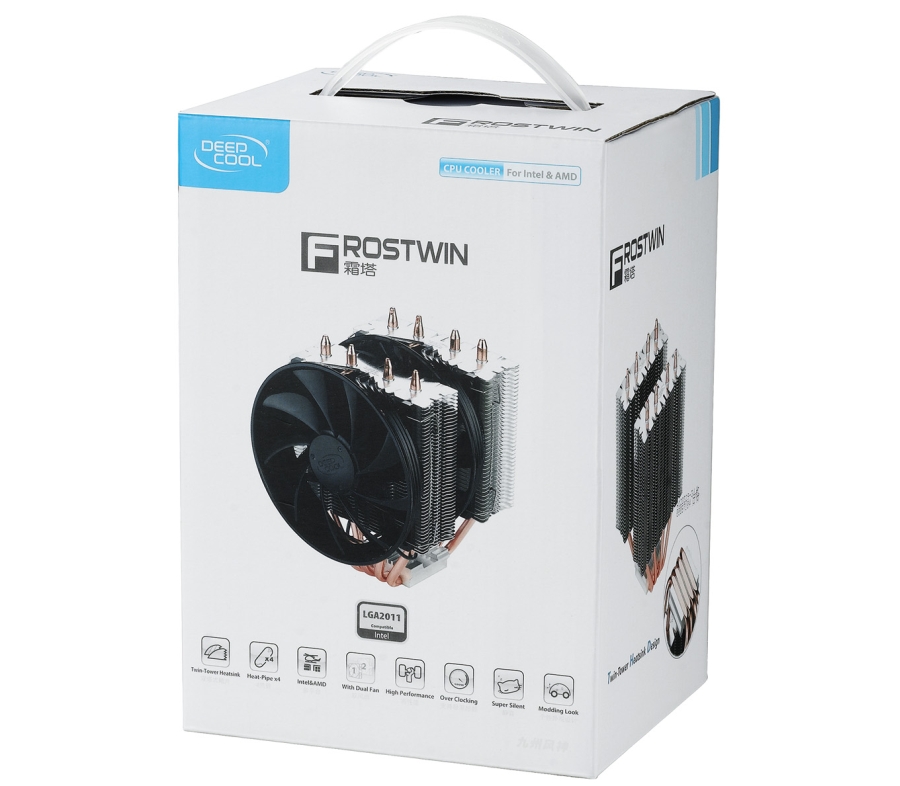 Упакована система охлаждения достаточно надежно и просто. Коробка у Frostwin, оснащенная ручкой для переноски. Основные преимущества модели производитель вынес на лицевую сторону упаковки. Во время транспортировки не придется задумываться о её целостности и сохранности.