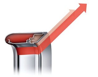 В режиме направленного потока воздух проходит по узкому щелевому каналу в задней части профиля аэродинамической формы, постепенно ускоряясь. В результате мощный поток теплого воздуха вырывается в определенном направлении посредством его фокусировки передней кромкой овального контура.
