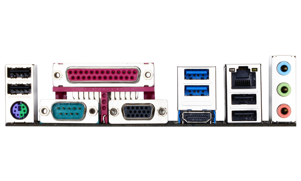 Внешние разъемыРазъемы на задней панели: 1 x PS/2 для клавиатуры/мыши 4 x порта USB 2.0/1.1 2 x порта USB 3.0/2.0 1 x COM-порт 1 x порт HDMI 1 x LPT порт 1 x LAN (RJ-45) 1 порт D-Sub 3 аудиоразъема (Line In, Line Out, Mic In) Видеовыходы будут работать только в том случае, если процессор имеет встроенное графическое ядро.