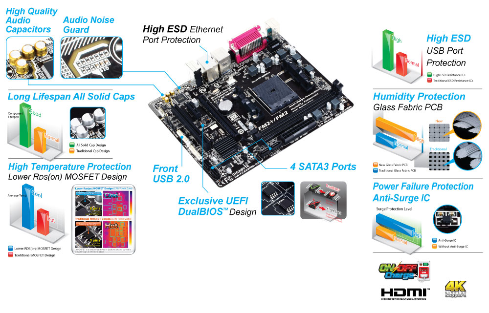 Материнские платы Gigabyte серии FM2+ оборудованы новым процессорным разъёмом FM2+ и разработаны для получения максимальной отдачи от новейших APU AMD Kaveri, сохраняя совместимость с APU в исполнении AMD FM2. FM2+ AMD APU обладают врождённой поддержкой интерфейса PCI-E 3-го поколения с пропускной способностью 8 Гбит/с а также поддержкой DX11.1 и высокопроизводительными вычислительными ядрами Steamroller.Обеспечивая чипсетом AMD A68H врождённую поддержку портов USB3.0 и SATA3 с пропускной способностью до 5 и 6 Гбит/с соответственно, платы GIGABYTE серии FM2+ отличаются повышенной стабильностью и эффективностью за счёт уникальной технологии Gigabyte Ultra Durable.