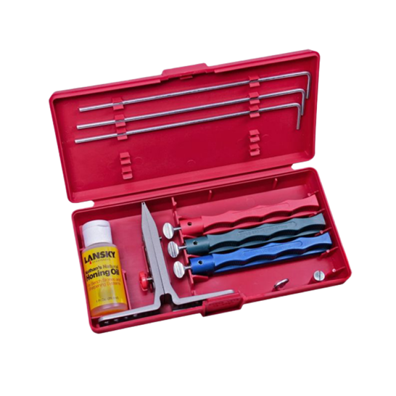 Каждый кейс Lansky Sharpening System включает запатентованный зажим для ножа со сменным углом затачивания, точильные камни с рукоятками, цвет которых обозначает зернистость камня, направляющие для каждого точильного камня и специальное масло для камней, позволяющее улучшить результаты затачивания.
