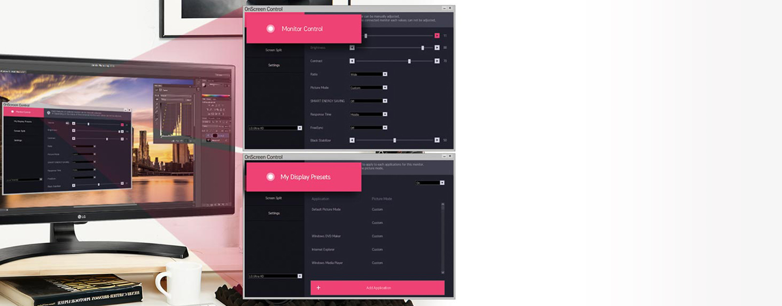 Благодаря меню OnScreen Control (Элементы управления на экране) и My Display Presets (Настройки «Мой дисплей») вы можете легко настроить параметры монитора несколькими щелчками мышью.