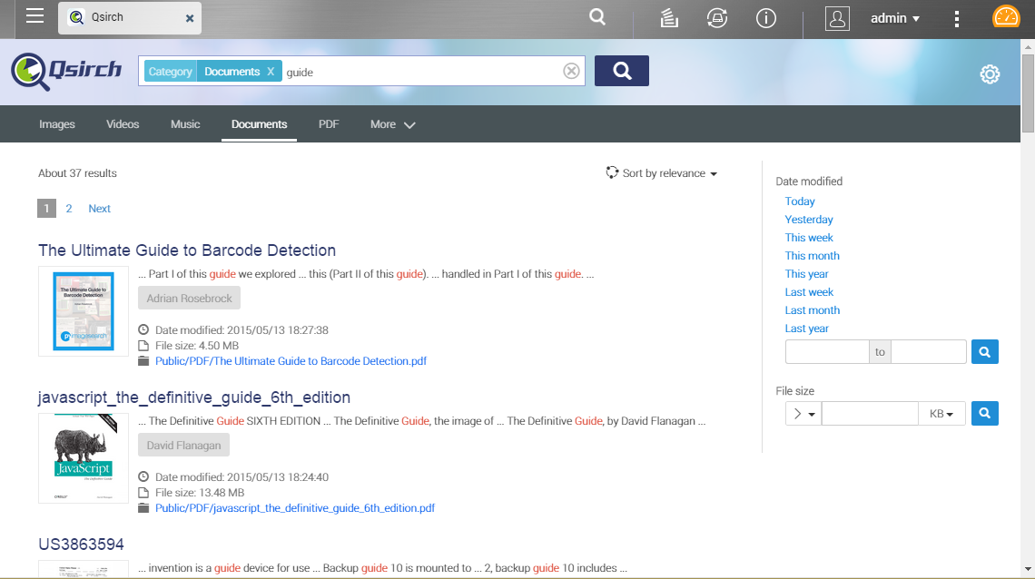 Благодаря Qsirch на QNAP NAS возможен полнотекстовый поиск конкретных файлов, в том числе документов, фильмов, песен и фотографий. С помощью алгоритма TF-IDF пользователи могут получить результаты во время ввода поискового запроса и легко определить файлы в списке совпадений по категории и с помощью предварительного просмотра. Поиск выполняется также по ключевым словам в содержимом файлов.