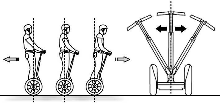 При наклоне тела ездока вперёд гироскутер начинает катиться вперёд, при увеличении же угла наклона тела ездока скорость гироскутера увеличивается. При отклонении корпуса назад самокат замедляет движение, останавливается или катится задним ходом. Руление происходит с помощью качанием колонки влево-вправо.