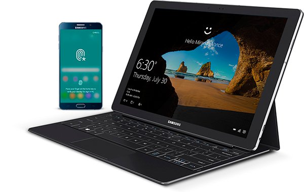 Синхронизируйте планшет Galaxy TabPro S со смартфоном Samsung, имеющим функцию распознавания отпечатков пальцев, и входите в систему планшета с помощью проверки подлинности отпечатка пальца на смартфоне.
