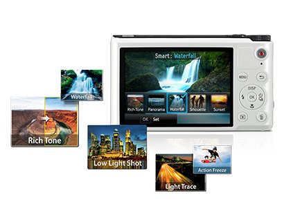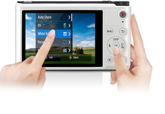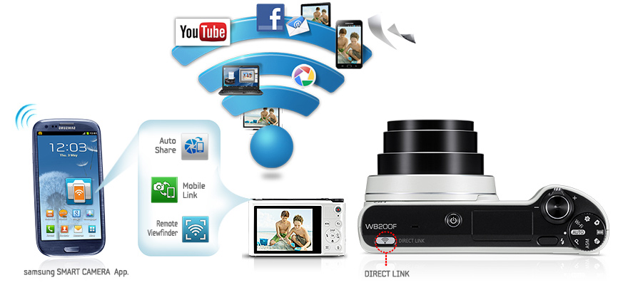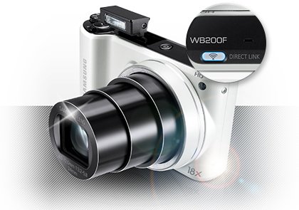 Оцените преимущества доступа к Wi-Fi сети и наличия интеллектуальных функций в SMART-камере. Горячая кнопка DIRECT LINK поможет вам быстро подключиться к Wi-Fi сетей, а с помощью функций AutoShare , Social Sharing, Cloud, email, AllShare Play и PC Auto Backup вы получаете возможность поделиться своими снимками и видеоклипами с друзьями и близкими. Кроме того, камера оснащена полезными встроенными приложениями, включая сообщения о наличии обновленной версии прошивки, Samsung SMART CAMERA App (Дополнения SMART-камеры), MobileLink и Remote Viewfinder (Удаленный видоискатель), которые позволят вам подключить камеру к смартфонов и планшетов.