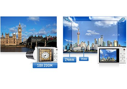 В любом месте и в любое время дня вам гарантированы яркие, контрастные и четкие фотоснимки. 18x оптический зум позволяет получать прекрасные снимки удаленных и близких объектов, а 24-мм широкоугольный объектив - лучший инструмент для съемки панорамы, даже более широкоугольной, чем можно видеть невооруженным глазом.Если же вы проводите съемку при низкой освещенности, то чувствительный 14Mпикс. ПЗС-2сенсор обеспечит яркое и четкое изображение с низким уровнем шумов.