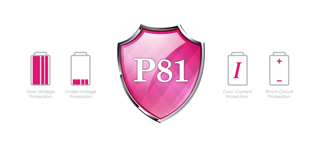 Power P81 оснащен комплексной системой электрической безопасности. Она включает защиту от перегрузки (OCP), низкого напряжения (UVP), избыточного напряжения (OVP) и коротких замыканий (SCP), аккумулятор также прошел международную сертификацию стандартов FCC, CE, BSMI и европейской директивы RoHS, так что вы можете использовать его с полной уверенностью в превосходном качестве и надежности.