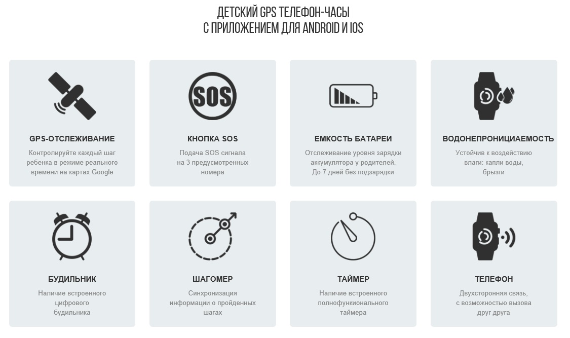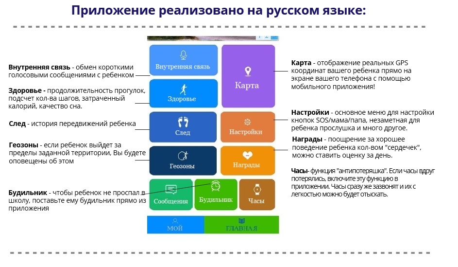 — Корпус часов – ударопрочен. Бесплатное русифицированное приложение для устройств на базе операционных систем iOS и Android обеспечивает реализацию множества удобных и полезных функций Smart Baby Watch, одна из которых – история перемещения ребенка. Кроме того, детские часы с GPS трекером позволяют совершать телефонные звонки, отправлять смс сообщения, считать шаги, и вдобавок ко всему это еще и удобные красивые часы с будильником.