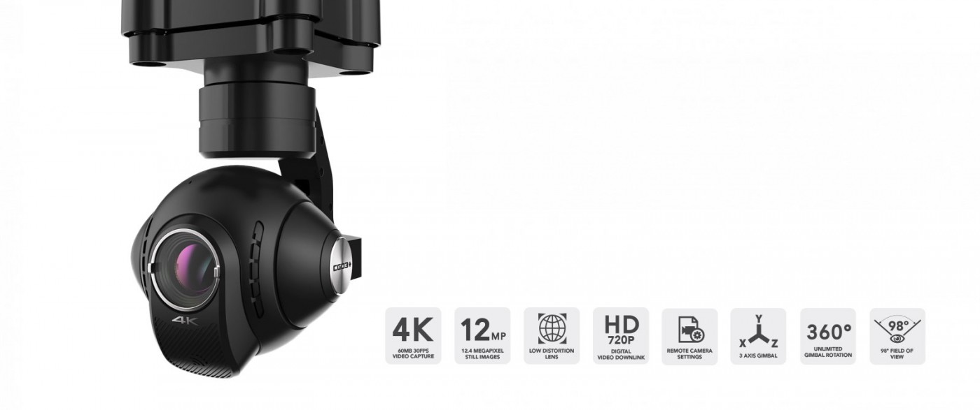 Полный 360 ° взгляд на мир 3-осевой антивибрационные CGO3 + карданный камера захватывает ультра-стабильную 4K Ultra High Definition видео, яркие 12-мегапиксельного изображения и может быть повернута на неограниченный, 360 ° диапазон движения. CGO3 + карданный камера имеет высокое качество стекла 98 ° поле зрения, широкоугольный объектив, и предлагает ручной настройки камеры во время полета.